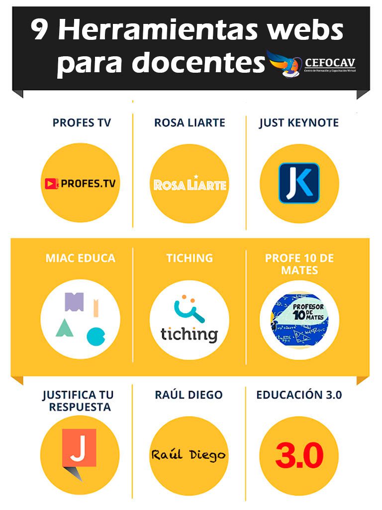 9 Herramientas Webs Educativas para Docentes por cefocav | Mar 15, 2021 | Blog Te compartimos las 9 herramientas webs educativas para docentes magníficas y con muy buena gente detrás de ellas. 1. Profes TV 2. Rosa Liarte 3. Just Keynote 4. MIAC Educa 5. Tiching 6. Profe 10 de Mates 7. Justifica tu respuesta 8. Raúl Diego 9. Educación 3.0